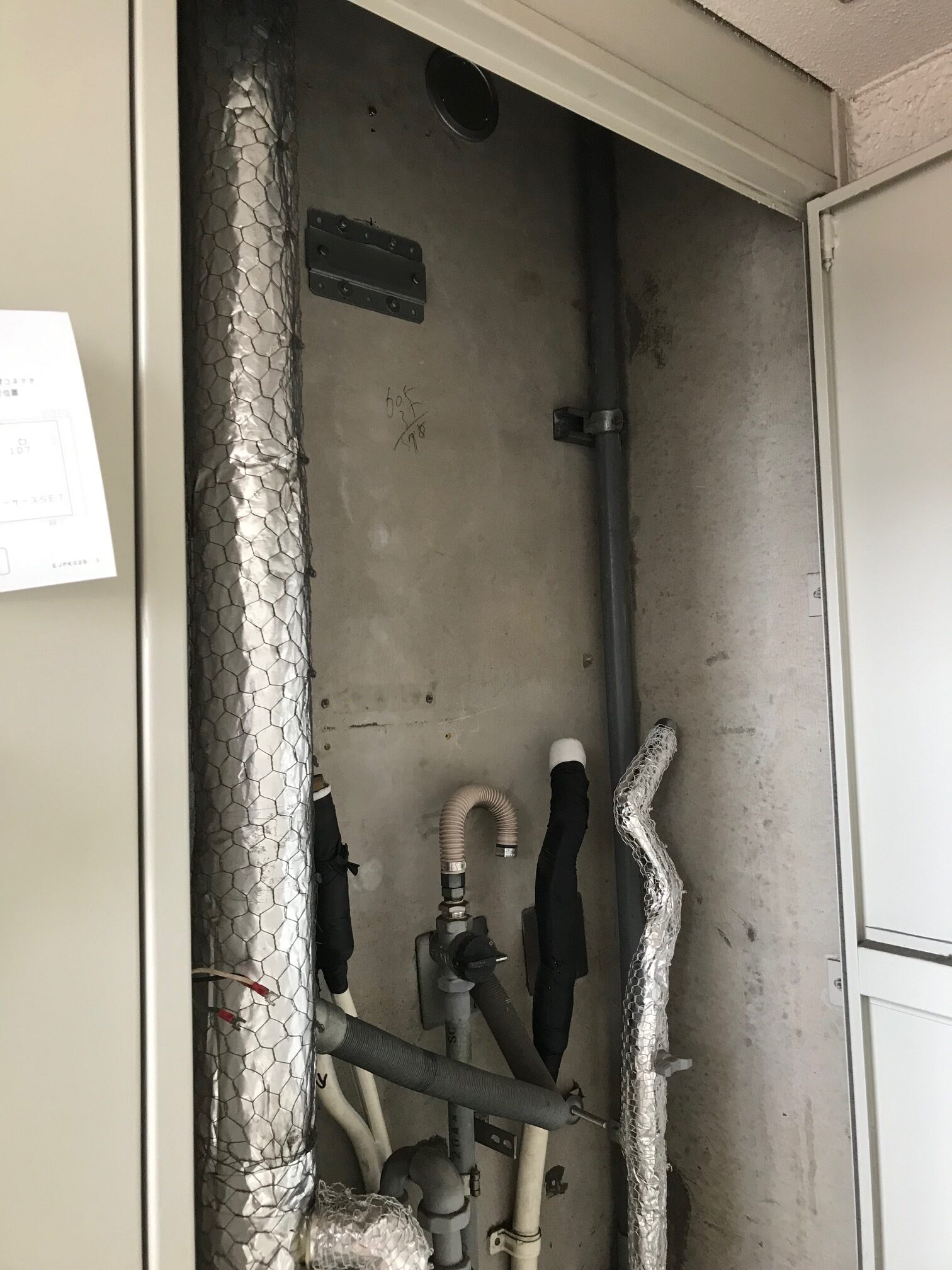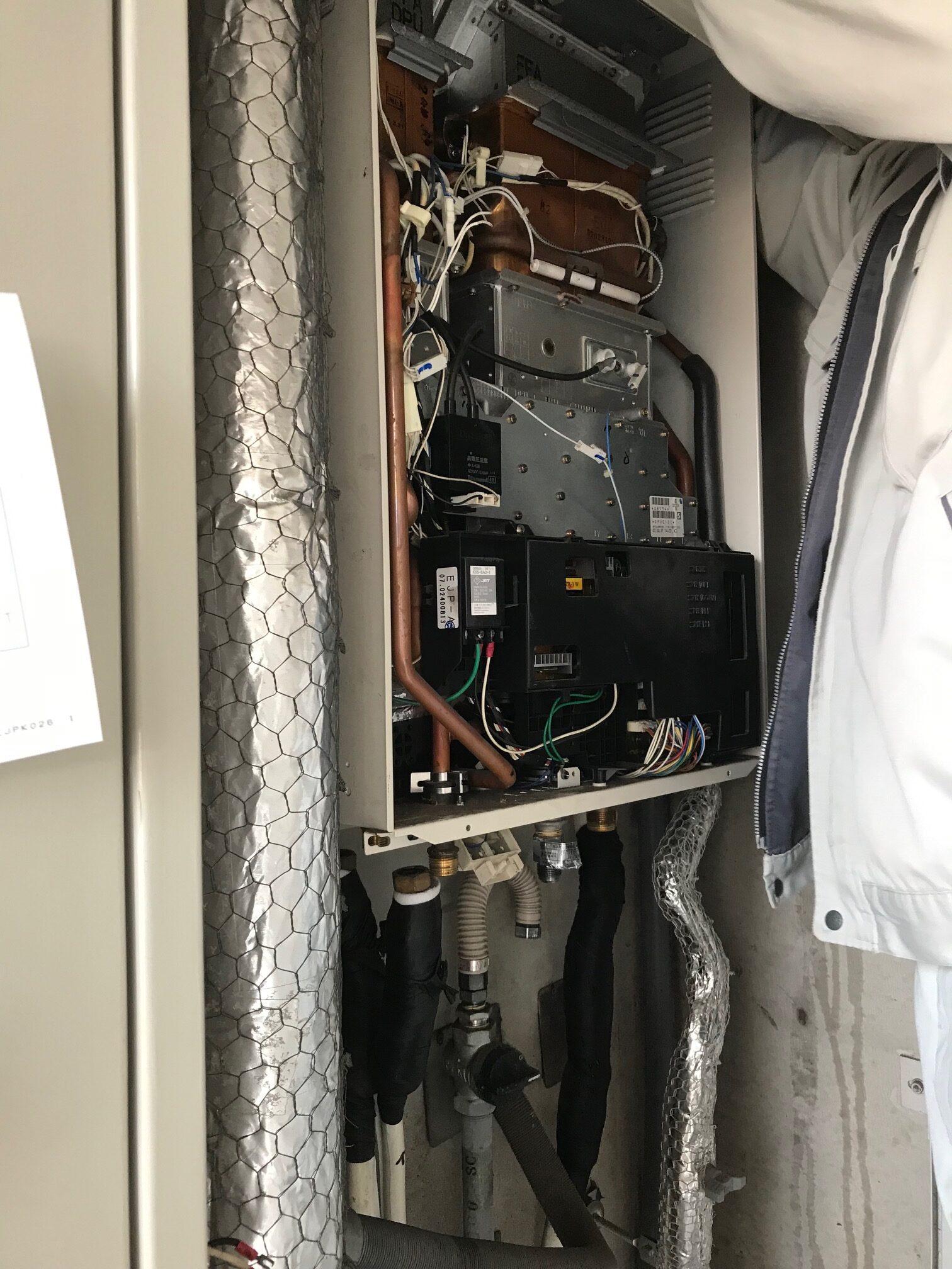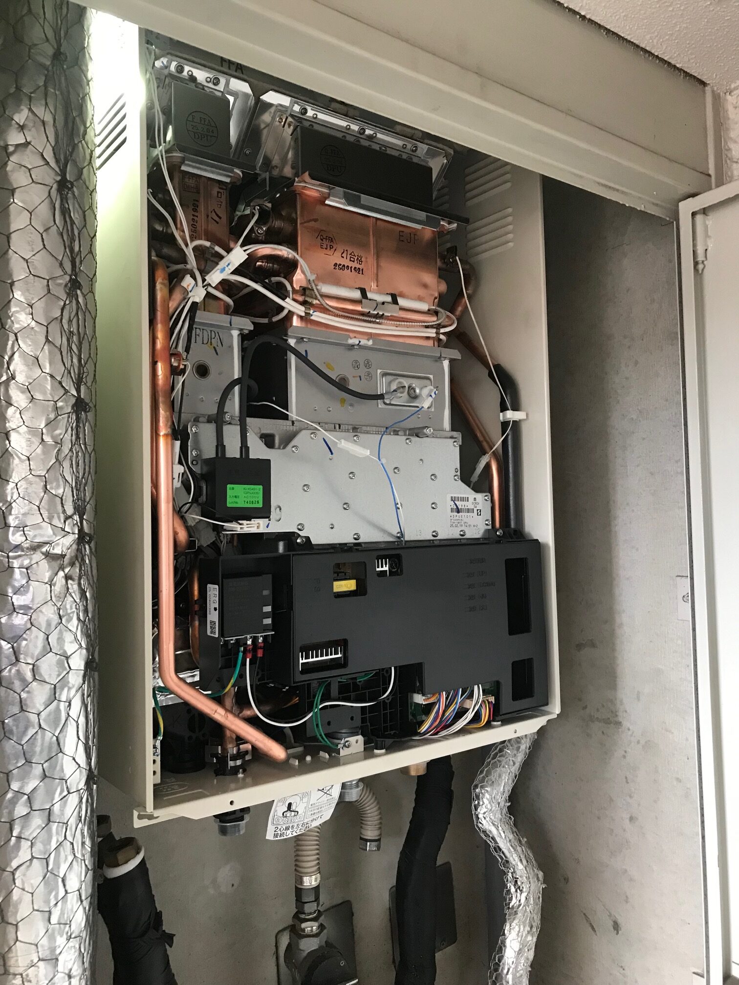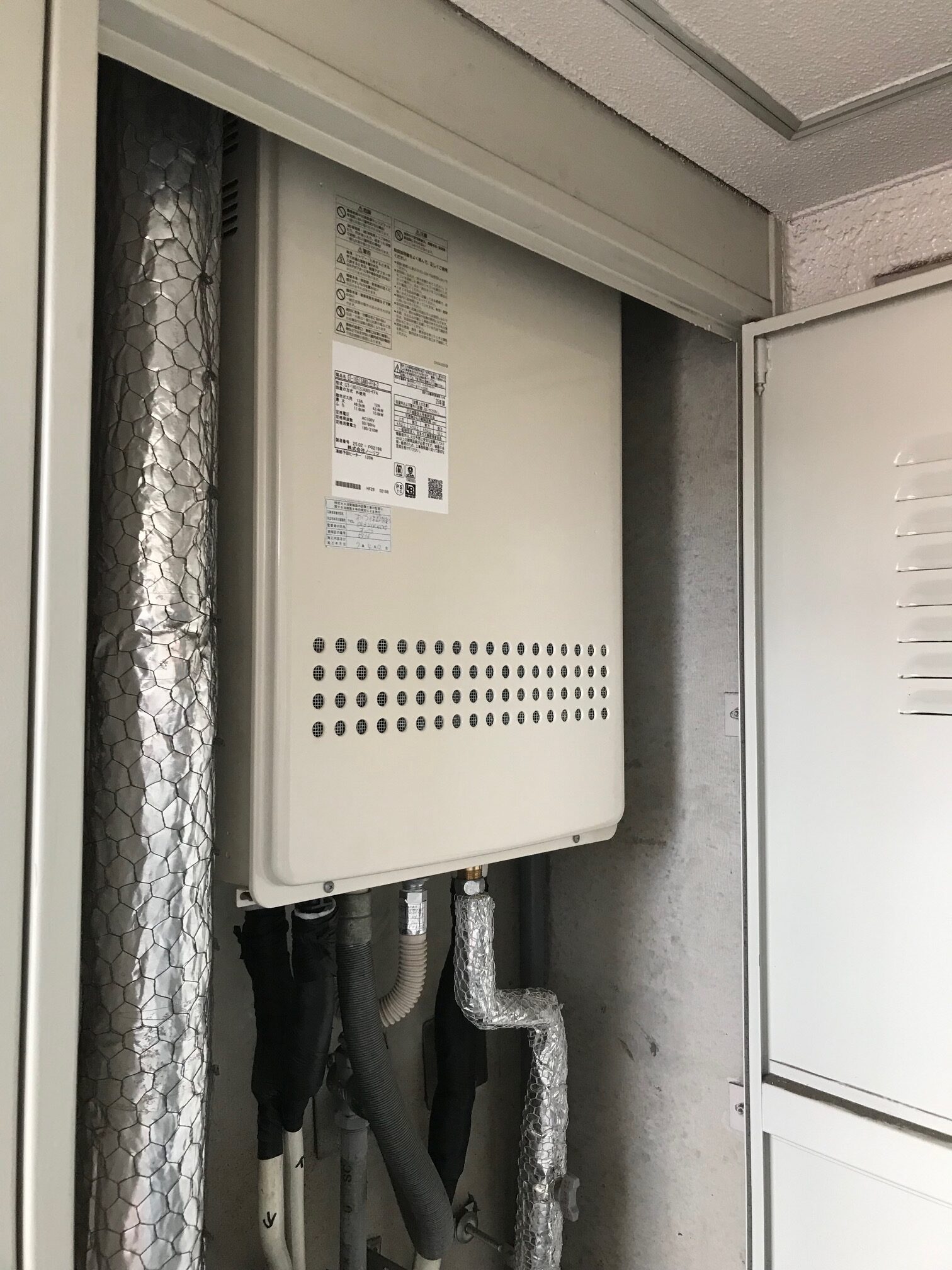 分譲マンションの給湯器の交換工事。強制給排気式の給湯器(給湯器の上に排気筒が付いているタイプ)
